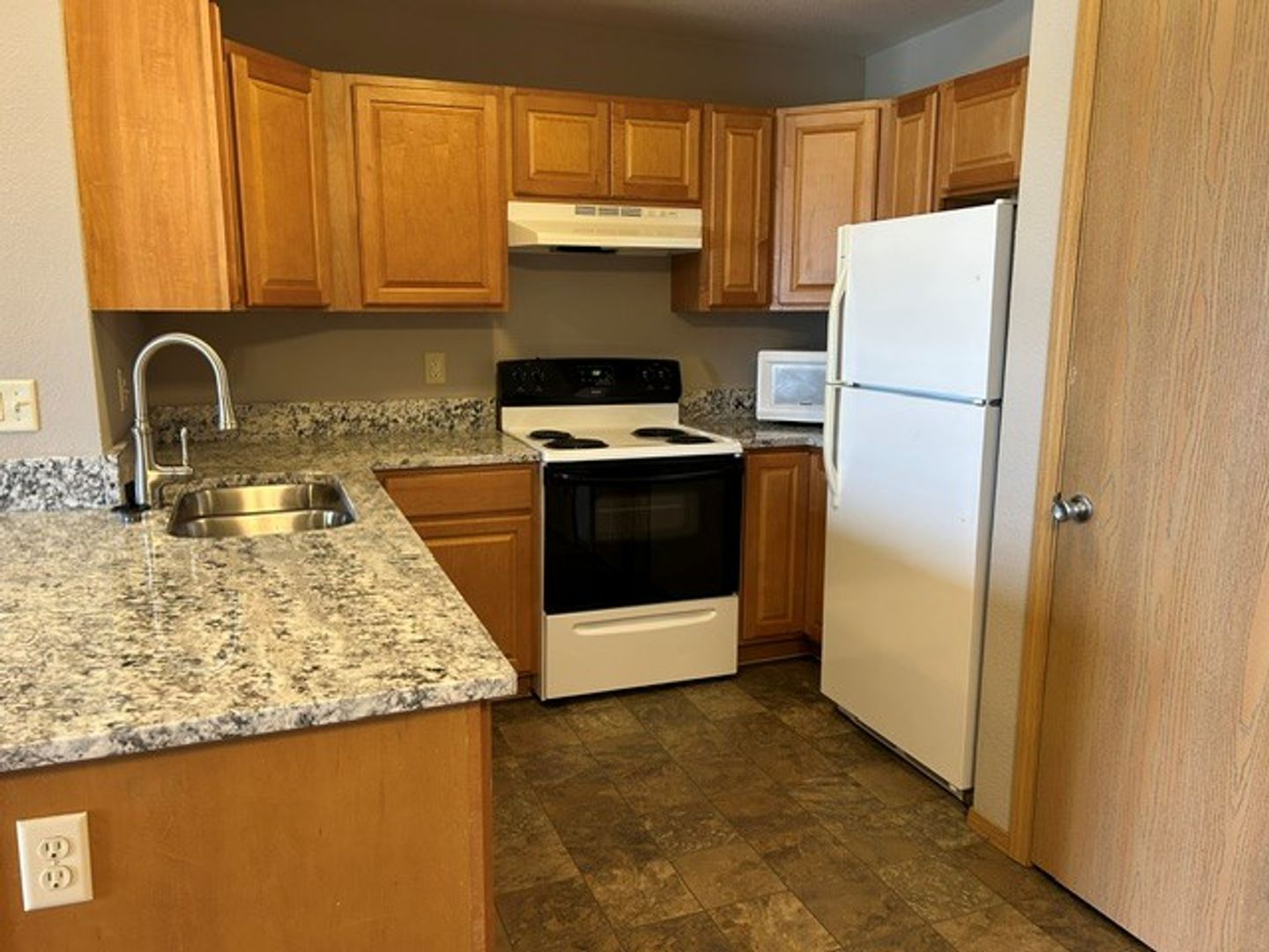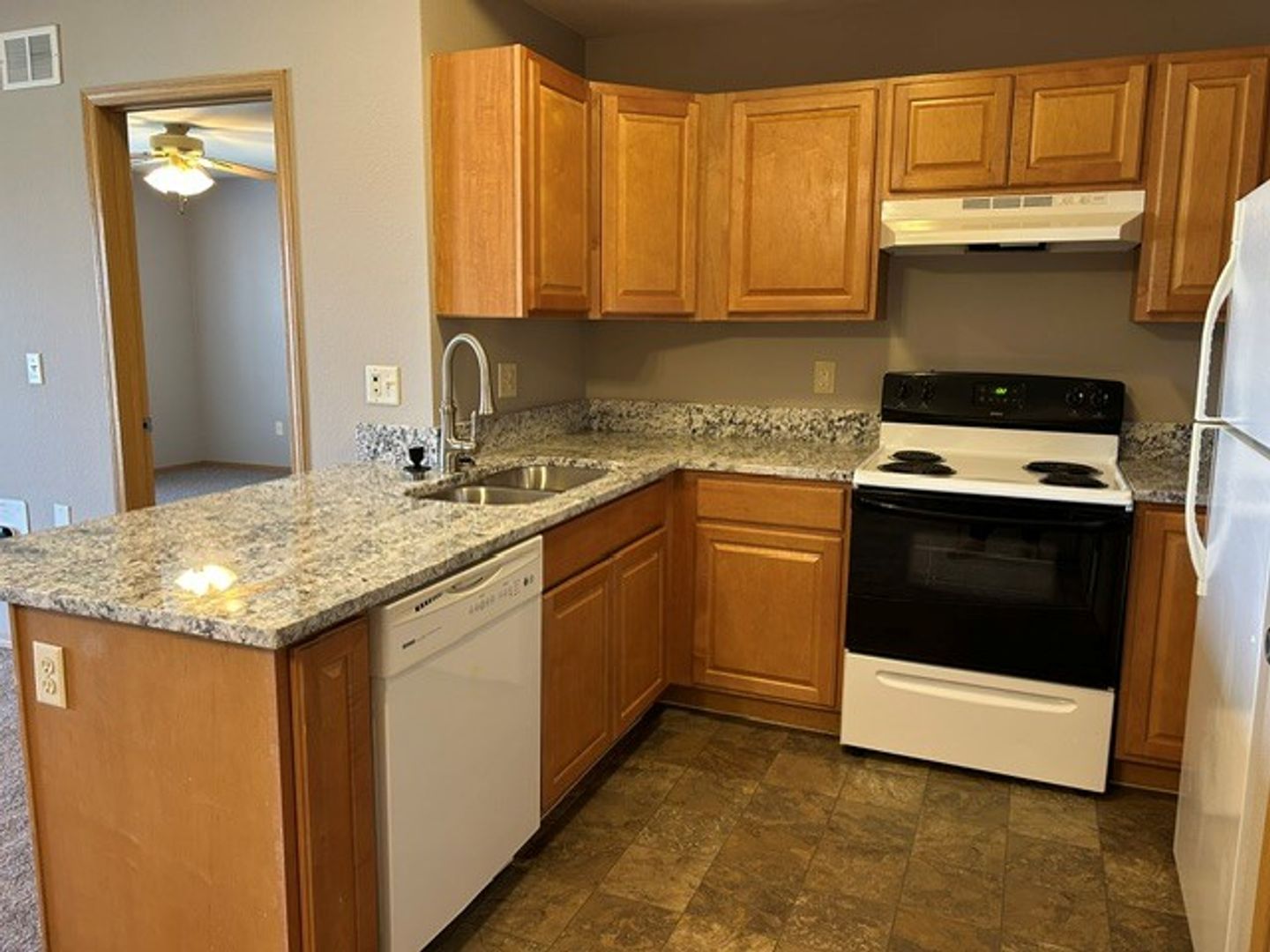 Wingover is our largest apartment complex. These apartments are designed to give maximum comfort, style, and convenience. Each apartment has an electric fireplace, patio or balcony, and washer/dryer. The ground floor units have a private entrance, and the third-floor units have a vaulted ceiling. The complex offers the following amenities: clubhouse for meetings and parties, swimming pool, fitness center, putting green, pickleball courts, and a pond. Garages are available for rent for an additional $125 a month.