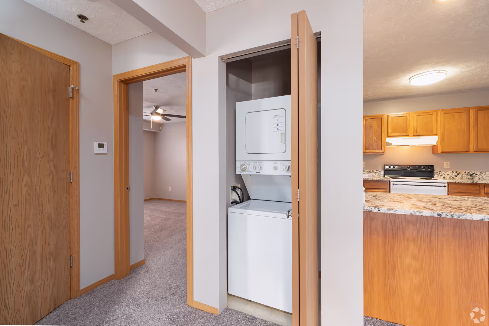 Wingover is our largest apartment complex. These apartments are designed to give maximum comfort, style, and convenience. The two-bedroom, one and a half bath apartments have a private entrance, electric fireplace, and stackable washer/dryer. The upper units have a vaulted ceiling. The complex offers the following amenities: clubhouse for meetings and parties, swimming pool, fitness center, putting green, pickleball courts, and a pond. Garages are available for rent for an additional $125 a month.